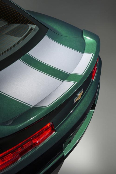 エメラルドグリーンのボディカラーにサイバーグレーのラリーストライプ、さらに21インチホイールを装備された特別モデルは、ZL1用のリアスポイラーを備える等、じつに洗練されている。