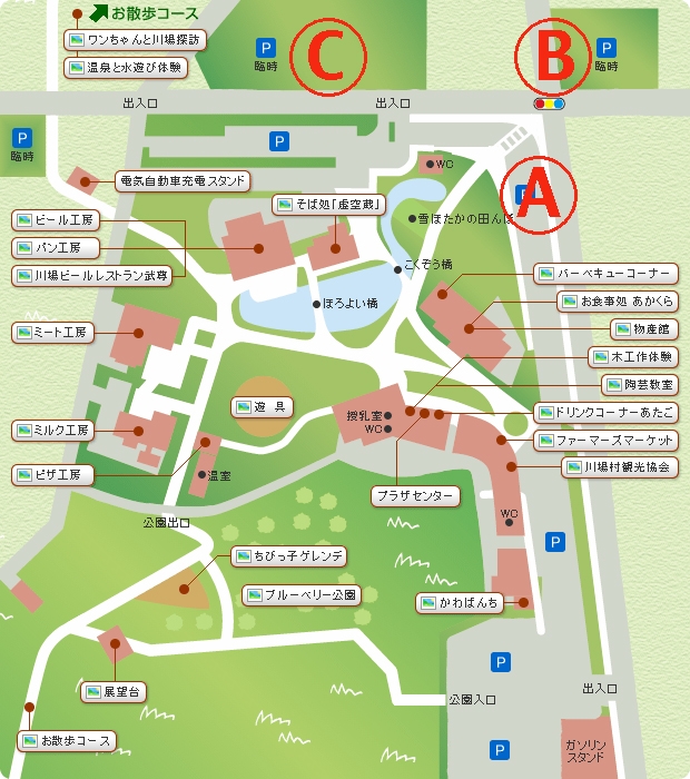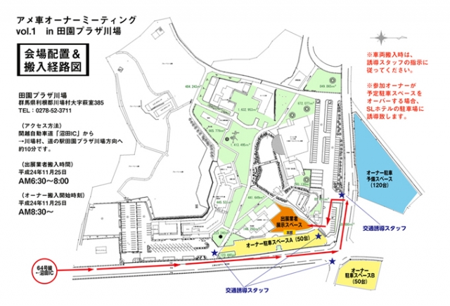 一般オーナーの駐車場所は、メイン会場前に50台(A)、道路を挟んだ向かい側に50台(B)、さらにその横に120台(C)となっていますが、その他にも予備の駐車場所は多数確保してあります。