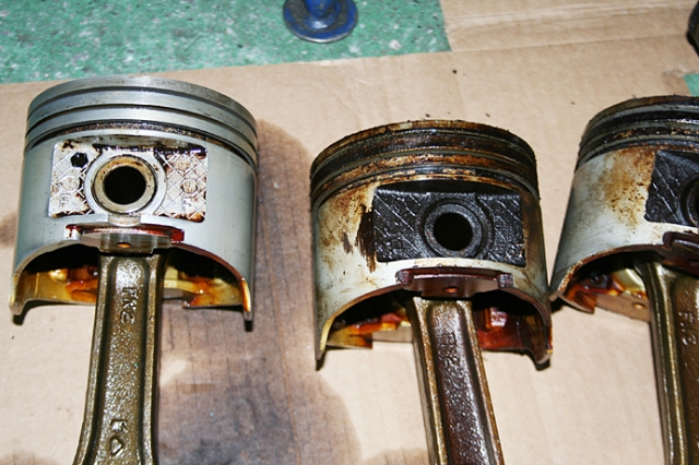 ピストンにナンバーリングを施し、堆積した汚れを落として行く。ちょっと磨いただけでこの汚れの差、お分かりいただけるでしょうか? もちろんこの後すべてをピカピカにした。