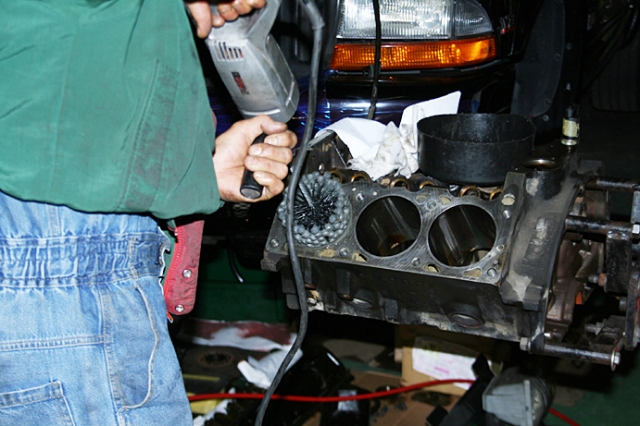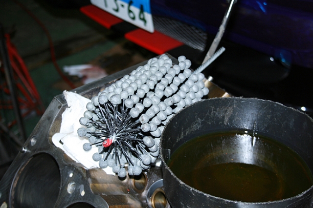 電気ドリルに組み合わされたフレックスホーンを回転させながら、シリンダー内を上下させ押したり引いたり。そうやることで、シリンダー内にクロスハッチが付き、それを丁寧に確認しながら全6本のシリンダー内の作業を終える。