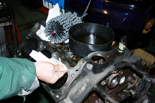 驚くことに、こういった作業用の工具までもが普通に揃っているのがアメリカ! ワイヤブラシに砥粒のぶつぶつがついた特殊工具を持ち出し、それを電気ドリルと組み合わせ、シリンダー内壁の研磨を始めたのである。