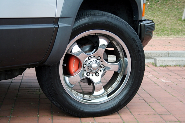 数年前に装着していたレーストラックオリジナルの20インチホイールにSSBCの2ポッドキャリパーを装着。この取材後に18インチホイールに交換してバネ下重量の軽減を図るという。