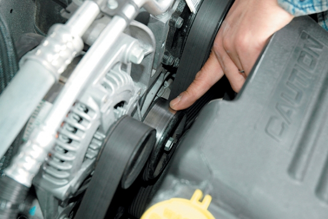 テンショナーはGM車でたまにアームが外れるなどのトラブルが発生しているが、デュランゴではそこまでのトラブルはない。ただし、経年劣化で動きが悪くなってくるので、ベルトを押して戻りが悪いようなら交換した方がいいかもしれない。プーリーは表面のツヤが均一であるかどうかを参考にして劣化の状態を確認しておくこと。