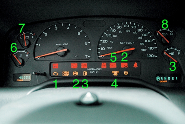 上記メインカットのメーターインジケーターに番号をふっている。それを下記にて説明しているので確認して欲しい。基本的なものばかりであるが、知らないよりも知っていた方が良いに決まっているものばかりである。