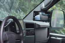 リアウインドーのないカーゴバンならではの死角を考慮して、右ドアミラーの下にカメラを設置。モニターはまるでドアミラーを見ているかのような位置に取り付けてある。