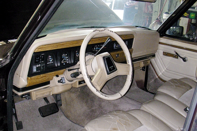 引き取った状態のままのインテリア。使用していた各部詳細(ステアリングやシート)にはキズや剥げが見られるが、全体を見渡すとそれほどダメな雰囲気はなく、そういった消耗部分を修復&交換&クリーニングしていくことで、十分再生可能と判断し各種パーツの手配にはいった。