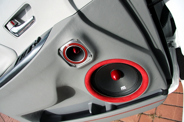 ドアパネルに埋め込まれたスピーカー。音の向き、方向、跳ね返り等を考慮して配置されている。不用なノイズや振動を抑制するデッドニングにも配慮されている。