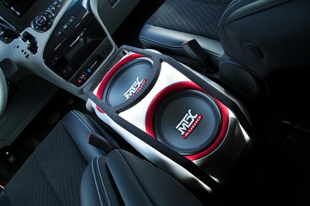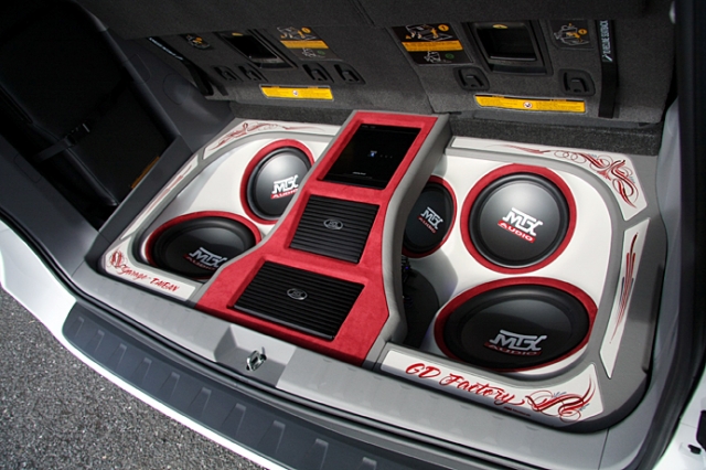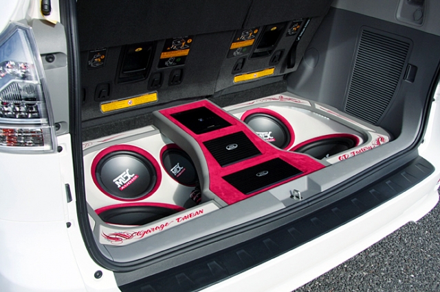 ウーファーはMTXの8、10、12インチを使用し、アンプはアルパイン。ボックスのくぼみたパーツの配置は音の方向や流れを意識してのもの。LEDでライトアップされることで華やかなムードが漂う。
