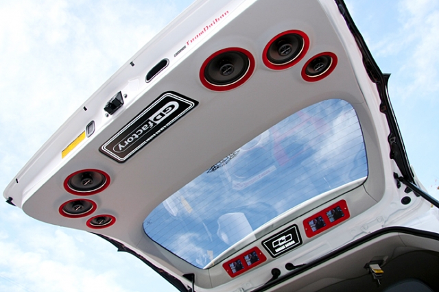 こうした一連のオーディオパーツのインストールに関しては、ガレージダイバンの音響メカニック(GDファクトリー)が担当している(某有名オーディオショップで修行していた)。室内での音の跳ね返りやリアゲートを開け放った時の外用のサウンド等を研究し取り入れることでウーファーを変則組し、またスピーカーを立体的に組み込むことで驚きのサウンドを構築している。当たり前だがこれらすべてはオーナーの意向に合わせてワンオフで構築されているのである。
