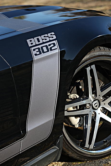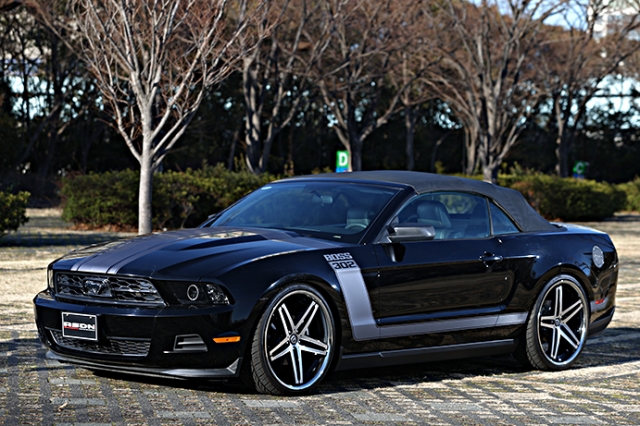 こうして仕上げられたブラックの2012年型V6コンバーチブルには、ボンネットから左右フェンダー、そしてドア下部を走るBOSS302仕様のデカールやレグザーニR-5の22インチ大径ホイール、そしてボディを絶妙な姿勢にロワリングさせるテインの車高調整キットなど、各ジャンルから厳選されたトップレベルのパーツが惜しみなく投入されている。