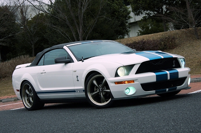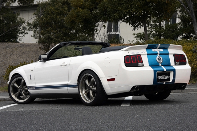2007年型マスタングV6コンバーチブルのSHELBY GT500仕様である。よっぽどマスタングに詳しい人でないと分からないくらいの完成度。しかも適度な小技も効いている。たとえばテールレンズをブラックのラッピングで後期型っぽくしたり、リアウイング内のハイマウントストップランプにシェルビーのロゴ が入ったプレート入れたり、ホイールのセンターキャップもコブラにしたり…、なかなか芸が細かい。