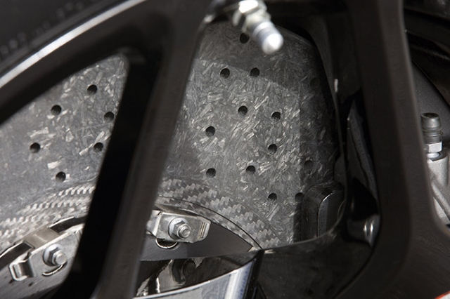 フロントリアともに19インチタイヤを装着する。タイヤはピレリPゼロT rofeo R。ホイール内には、6ピストンキャリパーとカーボンセラミック製ブレンボブレーキが装着される。
