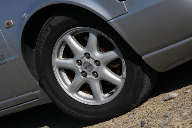見た目に関しては、そんなに大きなキズはないが、小キズは致し方ないだろう。だが総じて全体の印象は悪くない。お世辞じゃないが、意外にもキレイだ。とはいえ、ヘッドライトのベゼルは曇っているし、タイヤは硬く消耗しているし、内装も距離的なヤレは確実にある。レザシートのシワやヨレは張替え以外にはどうにもならないだろう。