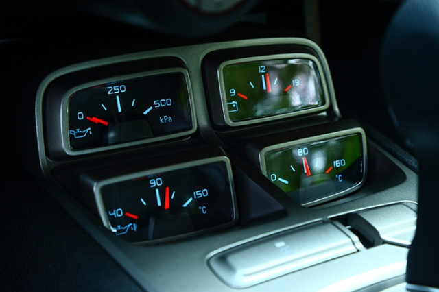 全体的な質感が非常に高く、造形的にも凝っているインパネ。デザイン的にもかなりの好感がもてる。センターコンソール下方には各種メーターが並んでおり(写真下)、そういったところにマッスルカー的な雰囲気を感じる。