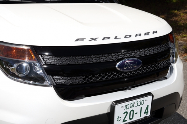 ブラックのフロントグリルは日本未導入のエクスプローラー・スポーツの純正パーツ。また、ボンネットフードとゲートのエンブレムもエクスプローラー・スポーツ用だ。