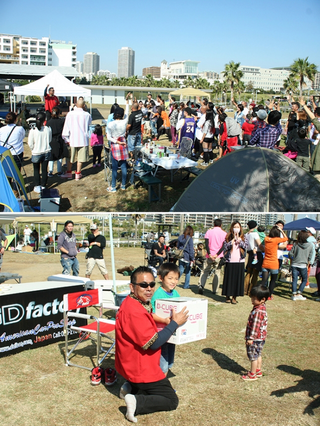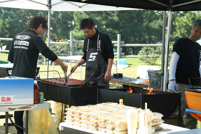 参加者それぞれで椅子やテーブルを持参し、場所取りをして準備万端。あとはダイバン自製のバーベキューコンロをで作られる焼きそばやホットドッグや焼肉をたらふく食べて、じゃんけん大会等のゲームに参加して、さらにクルマ談義に華を咲かせたりして…。