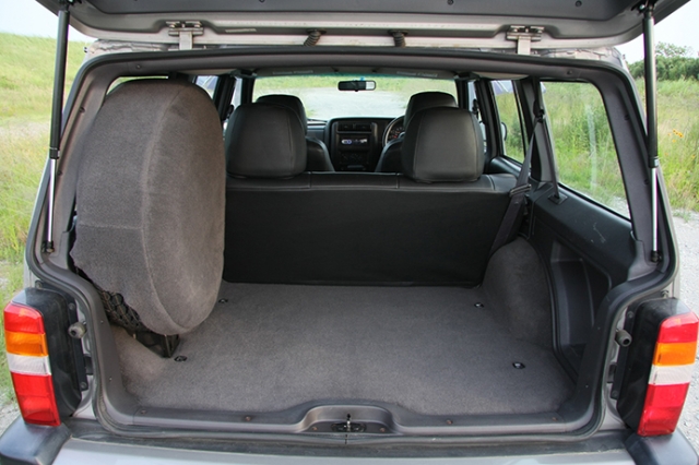▲リアゲートは縦に開くオーソドックスなもの。荷室はかなり広めにとっているが、スペアタイヤを置くと結構邪魔になる。ただ、スペース効率としては、ボディの割に大きい。
