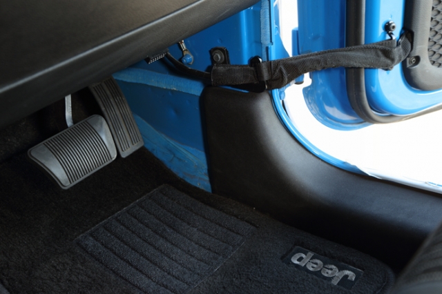 ドアストッパーがナイロン製のヒモであることに驚くが、これは昔のジープ同様にドアを簡単に外せるようにするためである。