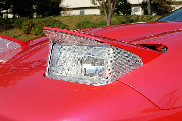 C5コルベットまでの最大の特徴であるリトラクタブルヘッドライトの復活。しかし、ただの復活ではなく、そこに演出を施す。具体的にはヘッドライト枠を縮め、その空いた隙間にスワロフスキーを張り巡らせ、さらにLEDで光の演出をする。だが、それはリトラクタブルを上げた時のセッティングであり、リトラを閉じたときのために、ヘッドライトカバーに小さなダクトを造り、そこからブルーのLED光が漏れるように別のセッティングも施した。お分かりいただけると思うが、上記のパーツは市販されている物ではない。ヘッドライトユニットを一度全分解し、手作業にて工作するのである。
