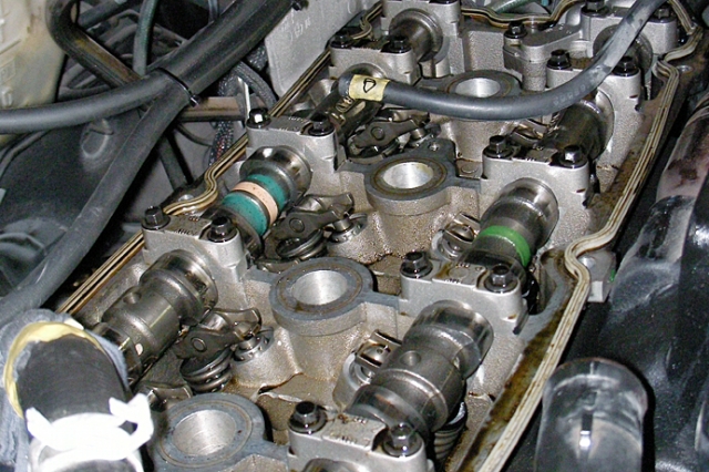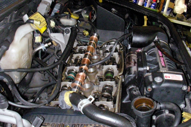 上記はノーマル状態のカム。今まさにこれから交換というところ。言葉で「交換」というのは簡単なことだが、実際の作業は補記類各種を外し、エンジンヘッド部分を開けて作業を行うために、手間はかかるが、効果は絶大。