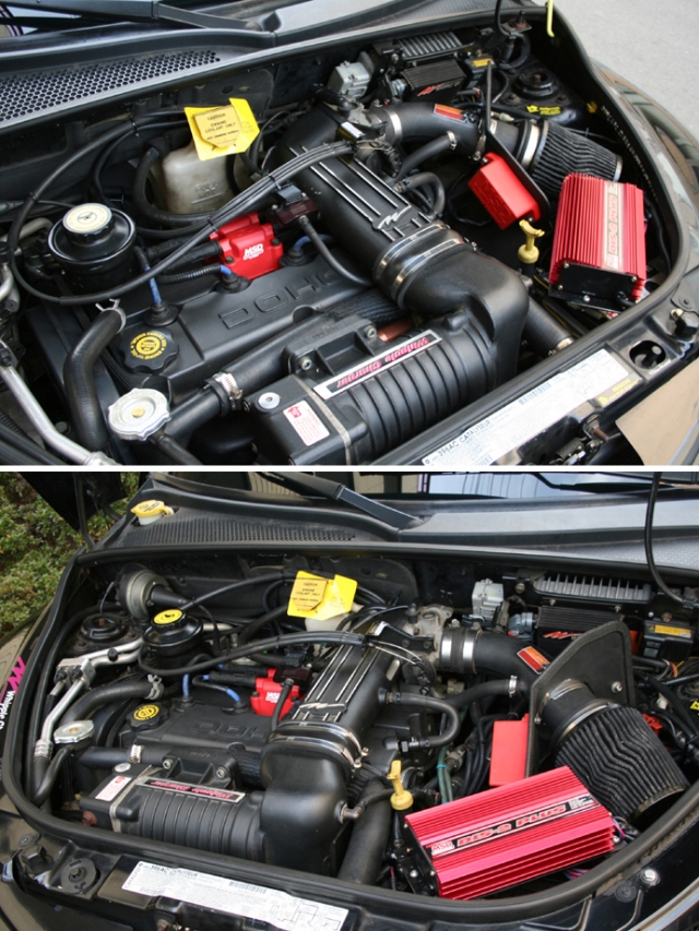 点火系のセッティングを終え、慣らし運転も終えた後のPTクルーザーは、まるで別物のエンジンを搭載したかのごとく生まれ変わった。写真下に見える赤いパーツはMSD デジタルイグニッションコントロールユニット。