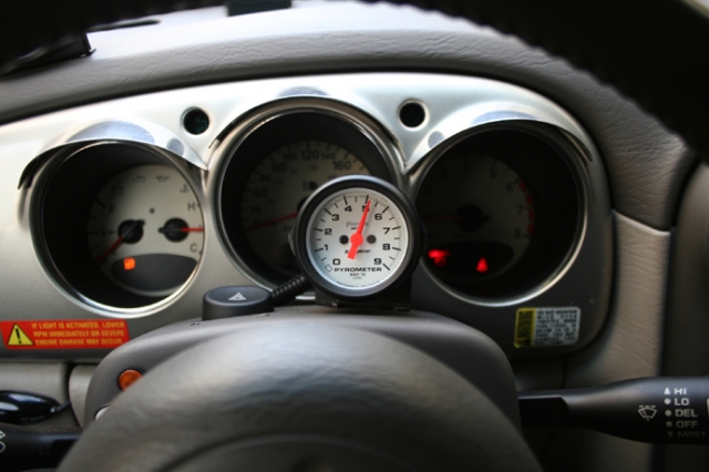 インパネの3連メーターの前に小さな排気温度メーターを取り付けた。エンジンを回せば排気温度が上昇するので、それを管理するため。