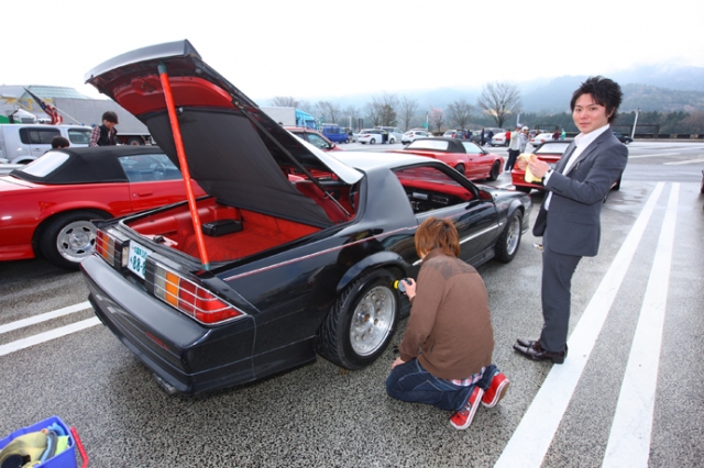 タイヤ磨いてますか(笑)? ブラック&レッドのカラーリングがステキなっサードカマロ。リアテールにモールがついたサードカマロを初めて見ました。