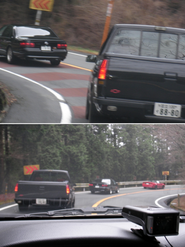 御殿場で高速を降り、そこからワインディングロードを通り富士宮に向った。そこで出くわしたアメ車は、5台でした。イーグルワゴン、サード2台、インパラ、454SSのテールを眺めながらの山道コースもオツなものでした。ちなみにこの写真はカメラマンが撮影したのではないので、ブレブレですが、雰囲気だけでも味わってください。