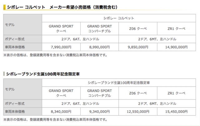 センテニアル・エディションはシボレーの正規ディーラーで販売されている現行C6コルベットの全てのモデルにラインナップされています。で、通常モデルとセンテニアル・エディションの車両本体価格を比べてみると、左の表の通りとなります(クリックで拡大します)。