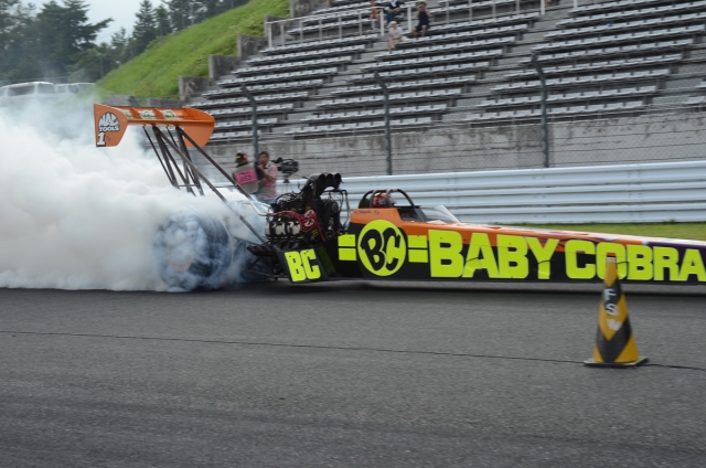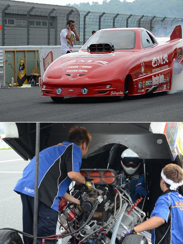 ドラッグレースの最高峰を担うトップフューエル。燃料はニトロメタン&燃費は5〜6メートルあたり1リッターという大飯ぐらいで、最高出力は5000馬力とも8000馬力とも。その迫力は他のクラスのマシンを圧倒するもので、サーキットに降りてみていると、体を叩く空気のしびれや脚に伝わってくるアスファルトの振動にビビる。