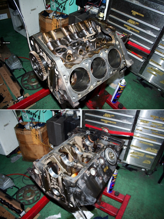 降ろしたエンジンを台座に載せ、そこからまたパーツをひとつひとつ外して、分解作業を行って行く。写真は分解後のブロックを上下から見たもの。