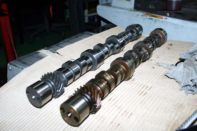 右が純正で装着されていたカムシャフト。左が今回のセッティングで本国オーダーをかけたカムシャフト。