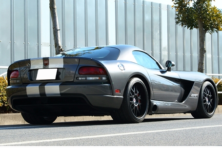 フロント19インチ、リア20インチのHREホイールを装着している。ガンメタのボディに合わせ、さらにバイパーの性能に耐えうる最高のホイールをセレクトした。