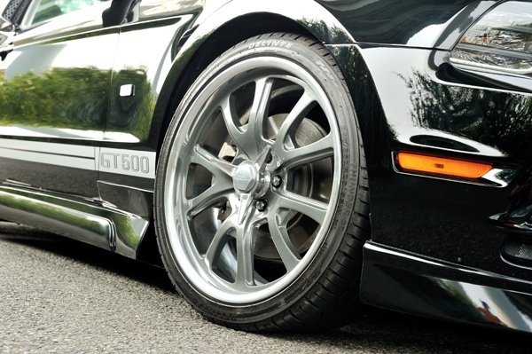 ホイールはエレノアをイメージして制作された専用デザインでサイズは前後とも20インチ。車高はローダウンコイルスプリングとパンハードロッドで低く調整されている。