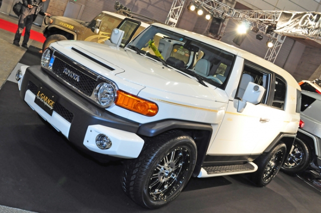 こうした盛り上がりに対し、大御所自動車評論家の車両インプレッションは、かなり厳しいものとなっている。「乗り味やハンドリングに現代的な洗練性はない」、「いかにもトヨタ的」、「RAV4チック」などなど。だが、こうしたインプレッションとは裏腹にショップでのFJカスタム率はかなりの勢いで増えており、その最たるものが今年のオートサロン2011であった。トヨタブースに展示してあったノーマルのFJを除いても20台近いFJが展示されていた。その半分近くがトヨタ系ディーラーが製作したデモカーだった。もしくはチューニング系メーカーがパーツを供給していた。トミーカイラのマフラーが装着されたFJには、さすがに驚きを隠せなかった。ということで、最新のカスタマイズFJをご覧ください。