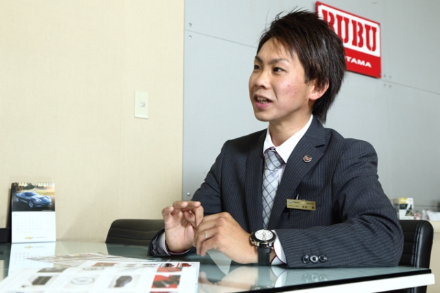 C7コルベットの正規輸入車の現状について解説して下さったシボレーさいたま南の坂本氏。この購入ガイドはBUBU光岡グループの正規販売店で取材させていただいたのだが、坂本氏の他にシボレー天白やシボレー高崎でもお話を伺った。