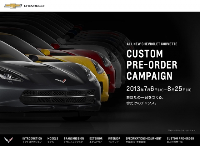 『カスタム・プレオーダー・キャンペーン』は、C7コルベットの日本正式導入が決まってすぐにアナウンスされた期間限定のキャンペーンであり、まだ発売価格すら決定していない段階で告知された。このキャンペーンのキャッチコピーは「あなたの一台をつくる、今だけのチャンス」。ちなみに、日本での発売価格の発表は2013年の12月である。