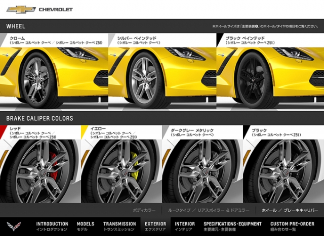 ホイールのカラーはクローム、シルバーペインテッド、ブラックペインテッドの3種類。ブレーキキャリパーのカラーはレッド、イエロー、ダークグレーメタリック、ブラックの4種類が用意されていた。クーペとZ51でホイールのデザインとサイズが異なっているのはカタログモデルと同じ。