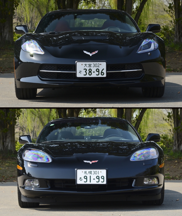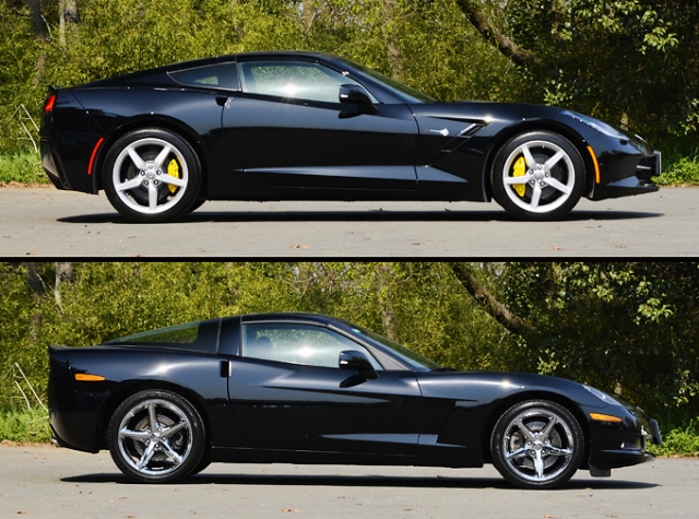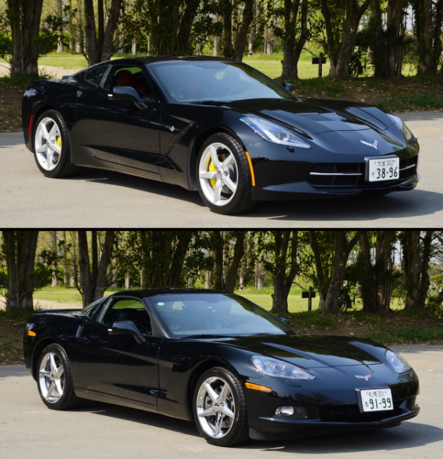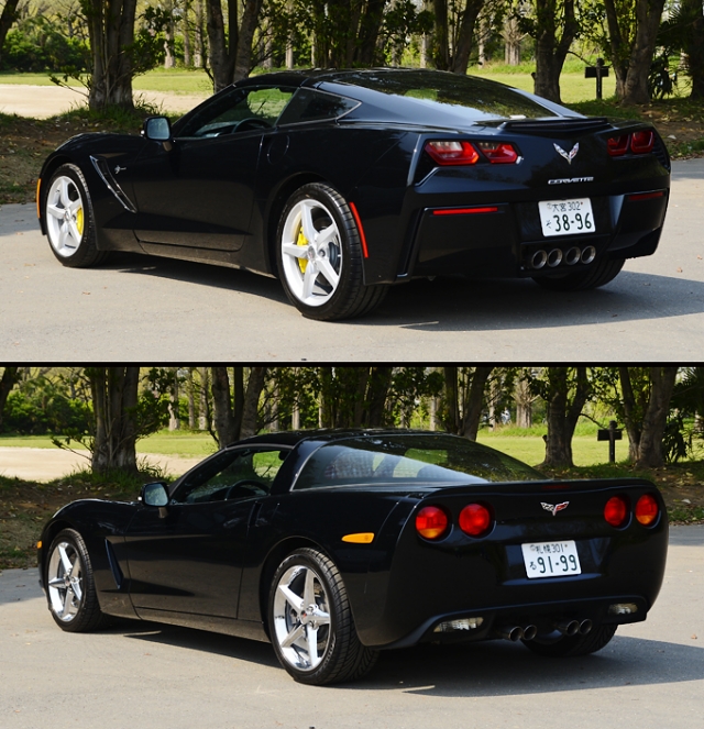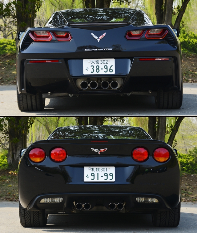 曲線基調で柔らい印象の強いC6と比べ、C7では細部のデザイン処理が鋭角的なので見た目の印象はかなり違うが、両車を同時に見比べると、全体的なシルエットはそれほど大きく変わっていない事が分かる。