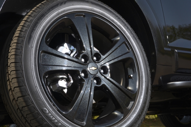 カーボンフラッシュペインテッドが施された純正の19インチホイール。キャプティバというクルマの性質を考えた場合、社外の大径ホイール&タイヤに交換するメリットは少ない。乗り心地や性能に関しては純正ホイールがベストだし、ペイントだけで十分だろう。