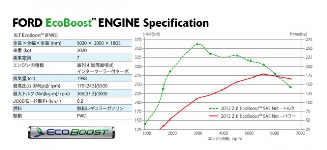 エコブーストエンジンとは、まさにフォードの技術力を集結した環境エンジンなのだが、高度なエンジン制御技術とターボチャージャーの改良によって、トルクの立ち上がりが遅れるターボラグや過給不足といったこれまでの問題点を解消し、燃費性能の向上と共に出力やフィーリングを制御することに成功したのである。