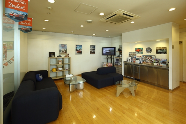 広大なディーラーショールームには5台の新車が並び、商談スペースにも余裕が十分。店外には認定中古車の在庫車が陳列されている。
