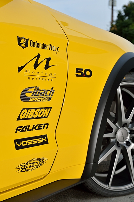 レーシーな雰囲気をもたらすステッカーチューンだが、このマスタングではスポンサーロゴのステッカーもブラックに統一し、全体の雰囲気をトータルでコーディネートしている。