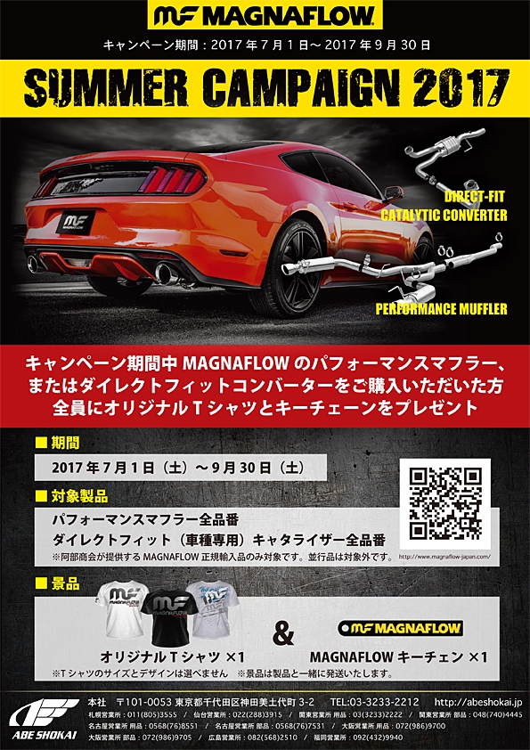 ※今回取材させていただいたマグナフローでは、2017年7月1日から9月30日かけ期間限定のオリジナルキャンペーンが行われる。内容は、マグナフローのパフォーマンスマフラーまたはダイレクトフィット(車種専用)キャタライザーを購入した全員に、国内未販売のTシャツとオリジナルキーホルダーがセットでプレゼントされるというもの。マフラーや触媒の購入を検討している方は、この期間を有効に活用するのが良いだろう。