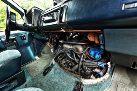 すでにへダースが装着されているが、エンジンルームからは見えないために、室内のオカマを外して撮影した。写真右下方に耐熱バンテージを巻いたへダースが見える。