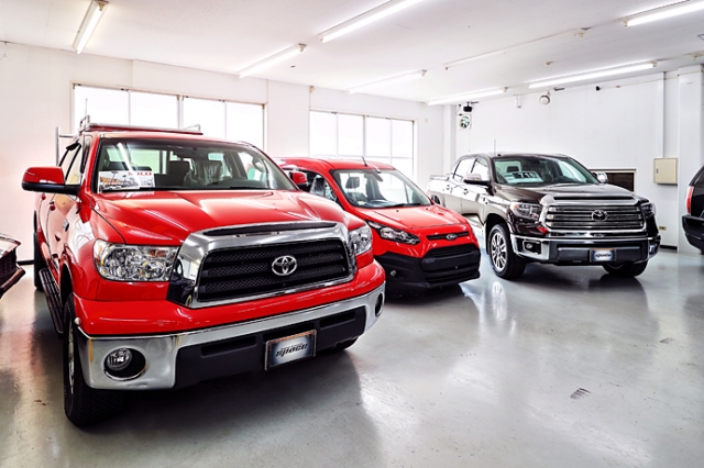屋内ショールームには、最新の車両や他店ではほとんど見かけない上級グレードのピックアップトラック等が展示されている。