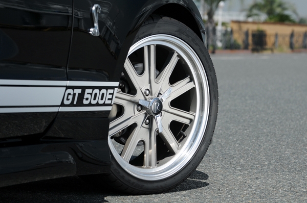 現行マスタング・エレノアのスタンダードな足回りは、ASDNオリジナルダウンサス+20インチAWとなっている。ASDNのダウンサスは、ノーマルサスに比べフロントで3.3cm、リアで約3.8cmほど車高が下がるように設定されているだけでなく、バネレートも若干高めに設定されている。また、エレノア専用の20インチホイールはフロント8.5J、リア10Jで、組み合わされるタイヤはフロントが255/35/20、リアが285/30/20。この低くなった車高とワイド&扁平率を上げたタイヤの組み合わせの効果は絶大で、エレノアはノーマルのマスタングよりもはるかに安定したコーナーリング性能を獲得している。つまり、エレノアのロー&ワイドなスタイルは、決して見た目だけの効果を狙ったものではないのだ。