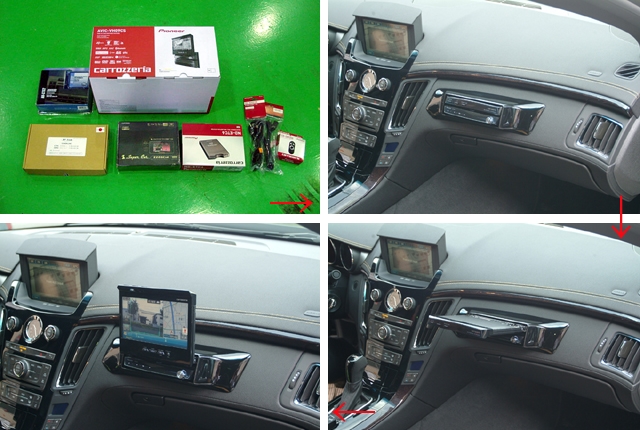 並行車がベースであるが、このナビがくせ者。日本製のナビを装着するのに一苦労。しかも最新モノを装着することがきない。したがって助手席ダッシュボードを加工し、最新ナビを装着することにした。この純正ポップアップモニターはDTV,iPod,DVD用としてきちんと機能させている。