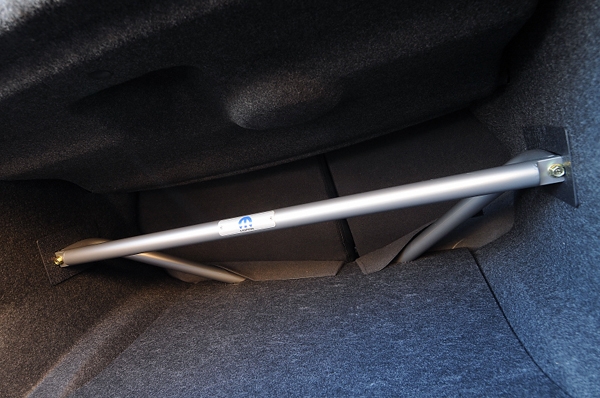 前後にストラットタワー・ブレースを装着する。トランク内に設置されたリアのストラットタワー・ブレースは取り外し可能。