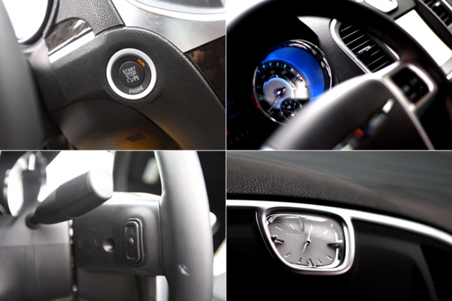スターターボタンにて始動する新型。メーター内のブルーライトが非常に優雅な空間を作り出す。ステアリング裏にあるボタンによって、シフト操作が可能。センターコンソールに装着されているアナログ時計も、良質な雰囲気作りにひと役かっている。